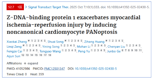 Zhang X, Song S, Huang Z, Zeng L, Song Y, Li M, Liu C, Cai F, Wang T, Yu P, Ge J, Sun A. Z-DNA-binding protein 1 exacerbates myocardial ischemia?reperfusion injury by inducing noncanonical cardiomyocyte PANoptosis. Signal Transduct Target Ther. 2025 Oct 7;10(1):333. doi: 10.1038/s41392-025-02430-5. PMID: 41052986; PMCID: PMC12501347.