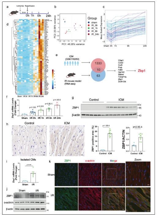 為探究ZBP1在心肌缺血-再灌注(I/R)損傷中的表達特征,研究者對小鼠心肌組織進行了時間序列RNA測序分析。結果顯示,ZBP1在再灌注階段(1h、6h、24h)表達顯著上調,且該趨勢在人類缺血性心肌病(ICM)數據集中亦得到驗證。進一步的細胞分離實驗表明,ZBP1的表達上調主要集中于心肌細胞,而在心臟成纖維細胞、內皮細胞及免疫細胞中未見顯著變化。免疫熒光染色亦證實ZBP1與心肌標志物α-actinin共定位,提示其在I/R損傷中可能發揮心肌細胞特異性作用。