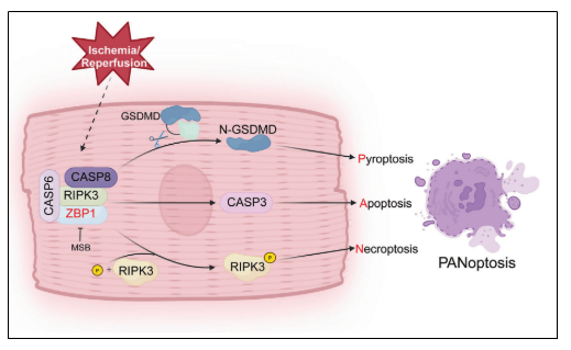 心肌缺血再灌注(I/R)損傷是心肌梗死再灌注治療中常見且嚴重的并發癥,其主要表現為心肌細胞死亡,進而導致心臟功能障礙和心力衰竭。盡管已有研究關注細胞凋亡、壞死、焦亡、鐵死亡等多種程序性細胞死亡形式,但單一通路干預往往效果有限。近年來,PANoptosis(泛程序性細胞死亡)作為一種整合多種細胞死亡通路的新型死亡模式被提出,其由PANoptosome復合物調控,涉及焦亡、凋亡和壞死通路的關鍵分子。
